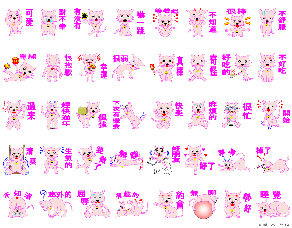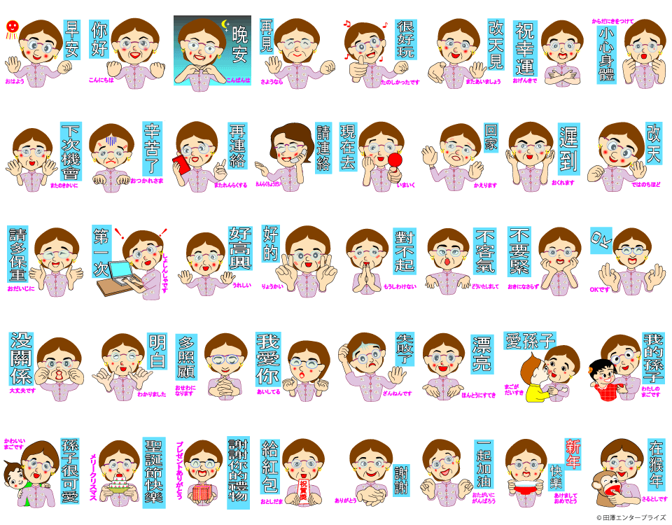 ※「元気な祖母【台湾版】」「つぶやき桃猫【台湾版】」は台湾限定スタンプです。日本で購入することはできません。